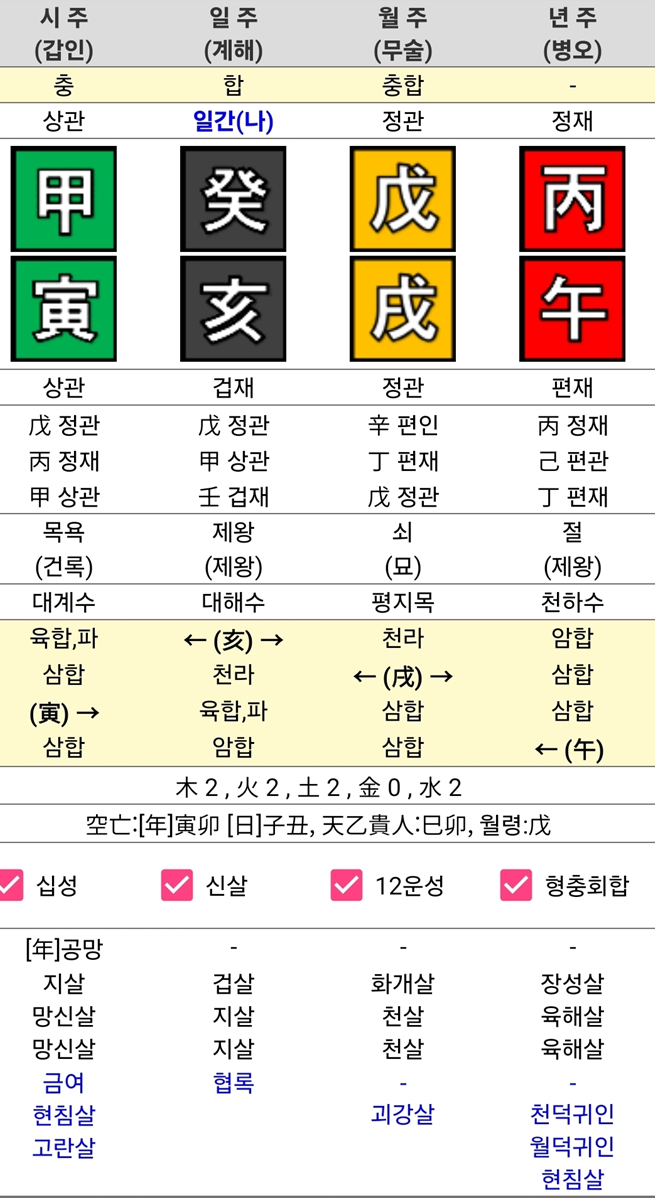 - 목(木): 시간 갑목, 시지 인목 (2개) - 표현, 활동 (식상 강함)