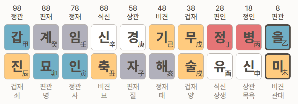 - 천간 乙木: 편관으로 일간 己토에게는 스트레스나 책임감을 주었을 수 있습니다.