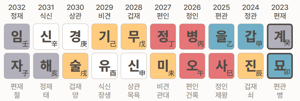 - 2023년 癸卯 (계묘): 편재 편관. 용신인 癸水가 들어와 재물운이 좋았고, 卯木 편관은 사회적 활동이나 명예적 성과를 가져왔을 것입니다.