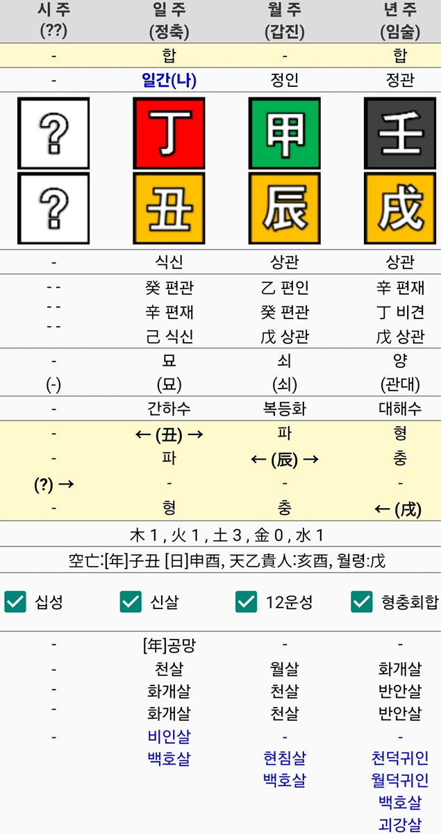 - 해수(정관)는 정화(丁火) 일간에게 천을귀인이자 문창귀인이므로, 귀인의 도움을 받을 수 있습니다.