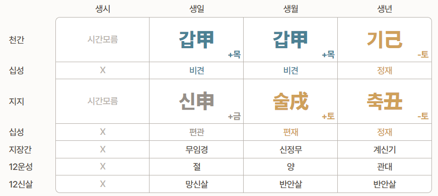 이 명식의 주인공은 일간(日干) 갑목(甲木)으로, 마치 넓은 땅에 깊이 뿌리내린 커다란 나무처럼 강한 기상을 지녔어요. 뻗어 나가려는 강한 기세와 타고난 리더십, 그리고 엄청난 책임감을 가진 사람입니다.