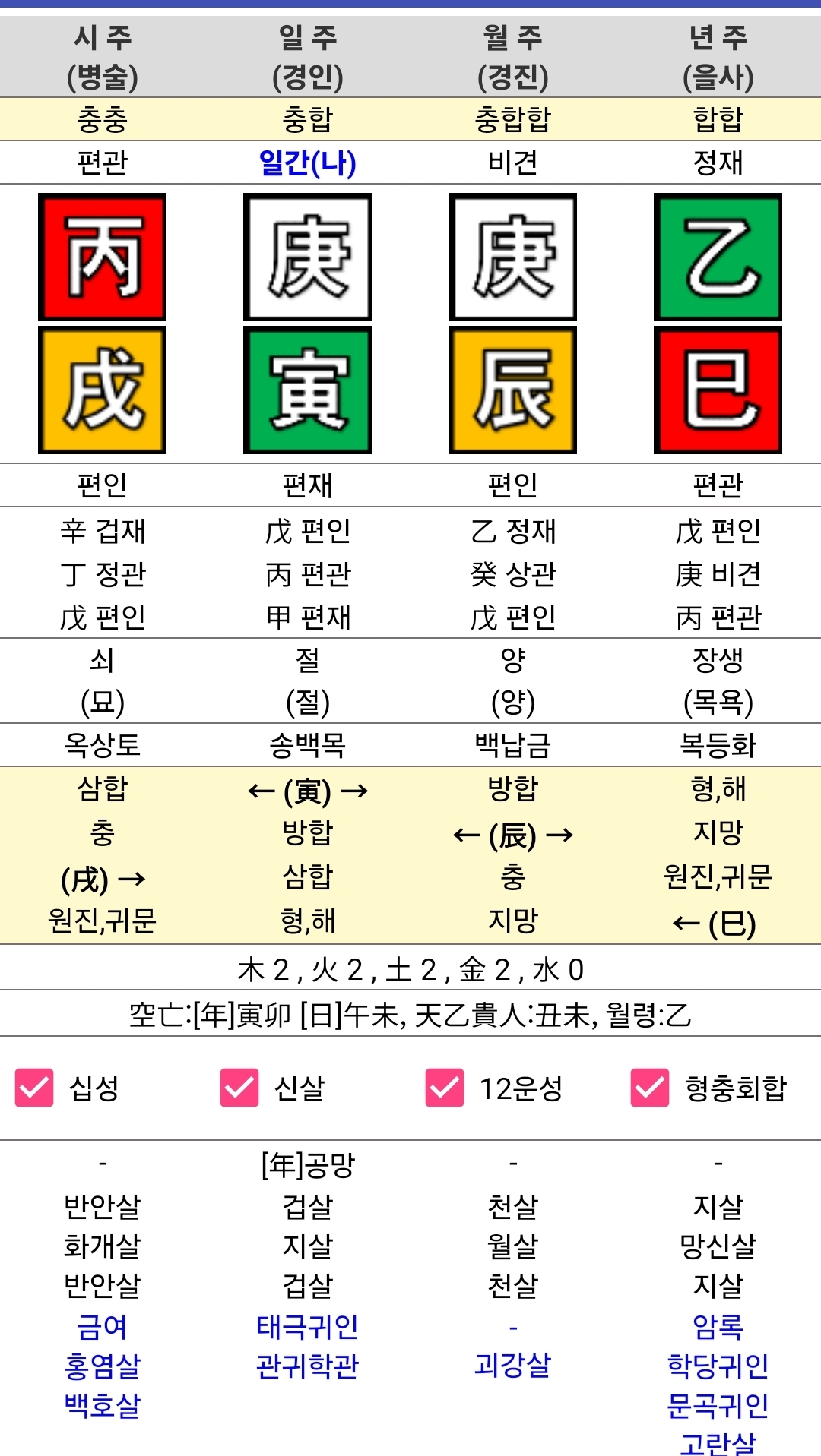 - 토(土): 월지 진토(편인), 시지 술토(편인) (2개) - 학문, 지혜, 자신을 생조 (인성 강함)