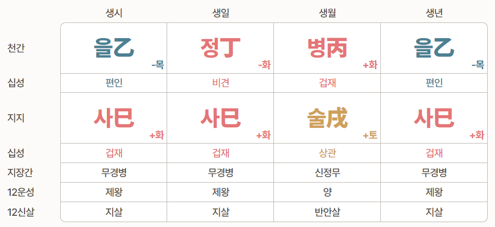 🌳 특성: 정화 일간에게 을사년의 편인과 겁재는 민감하고 예리한 감각을 지녔으며, 독립심과 승부욕이 강한 성향을 부여합니다. 독특한 사고방식과 남다른 시각을 가지고 있어 통찰력이 뛰어납니다. 병술월의 겁재와 상관은 강한 주체성과 함께 자신의 감정을 섬세하고 재치 있게 표현하는 능력을 나타냅니다. 감성적이고 예술적인 면모가 강하며, 때로는 날카로운 직관력과 추진력을 발휘합니다.