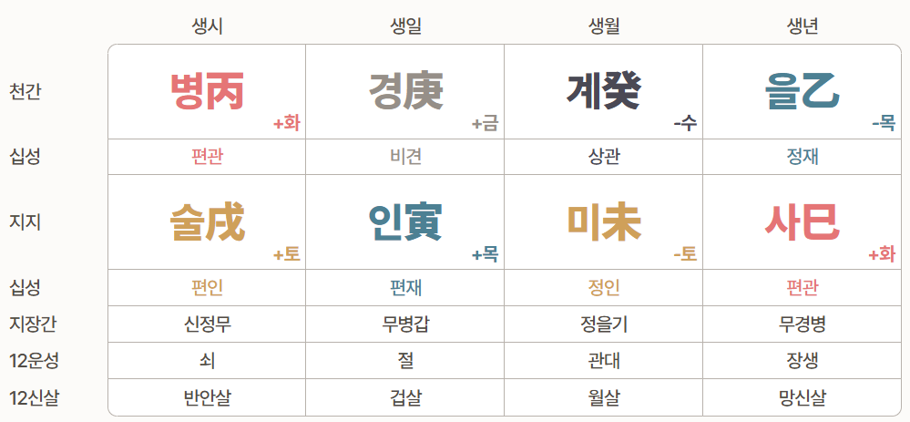 🌳 특성: 경금 일간에게 을사년의 정재와 편관은 성실하고 책임감이 강하며, 동시에 리더십과 카리스마를 지닌 성향을 부여합니다. 현실적이고 실속을 중시하며, 목표를 설정하면 강하게 추진하는 힘이 있습니다. 계미월의 상관과 정인은 뛰어난 표현력과 창의성을 겸비하면서도, 배움에 대한 열정과 따뜻한 마음을 나타냅니다. 겉으로는 강하고 단호해 보이지만, 내면에는 섬세하고 인정 많은 면모도 있습니다.