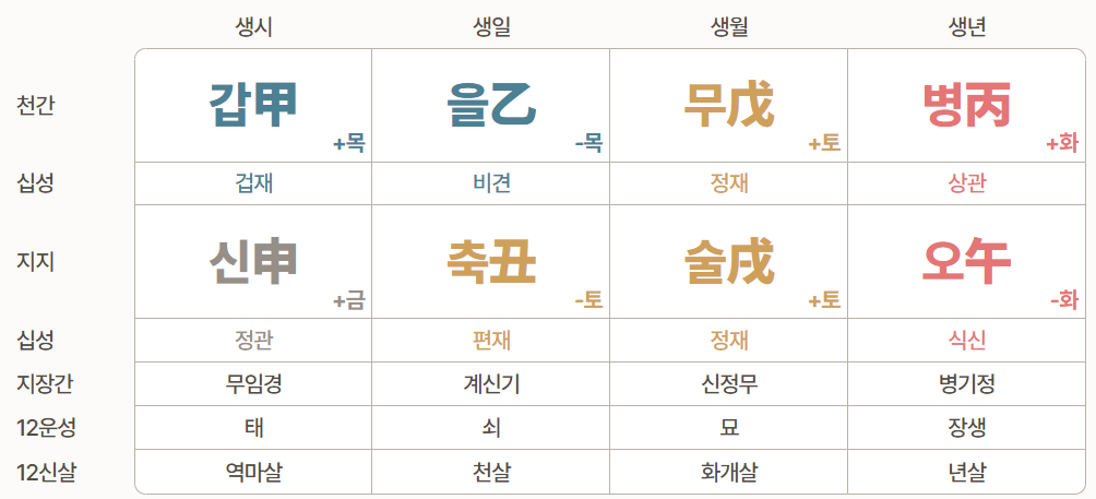 ※ 본 분석은 년주, 월주, 일간만을 바탕으로 한 것이므로, 정확한 사주 풀이를 위해서는 태어날 일주와 시주까지 알아야 합니다.